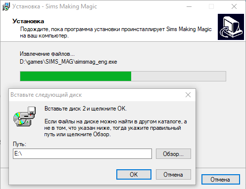 - Далее вас попросят вставить второй диск. Смонтируйте «The Sims — Makin Magic CD2.mdf», укажите путь до смонтированного CD-дисковода. Установка продолжится.